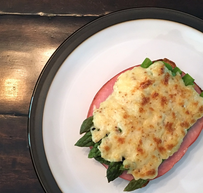 3/4 c. swiss cheese, shredded, 2 Tblsp. stone ground mustard, 5 Tblsp. mayo, 1 tsp. horseradish, Multigrain bread, Ham slices, 1 bunch asparagus