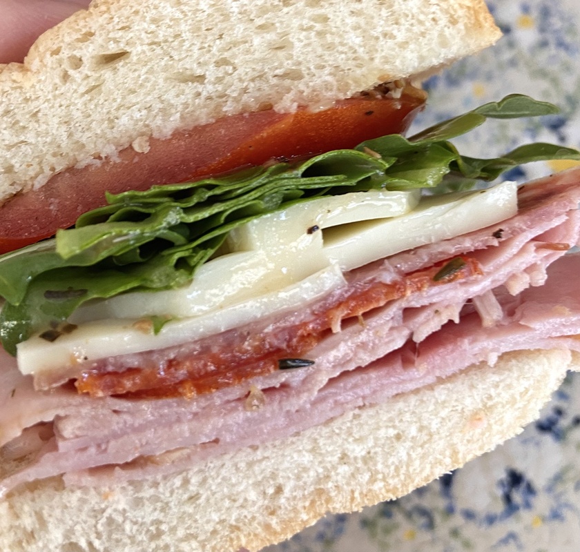 1/4 cup mayonnaise, 2T wholegrain mustard, multigrain bread, deli ham (honey-roasted), deli turkey (bacon-encrusted), cheddar cheese (white, if possible), 1 large beefsteak tomato, sliced, bacon, finely-sliced pickles, chives