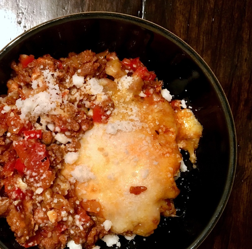 1 pound ground beef, 1 teaspoon dried oregano, 1 teaspoon dried thyme, Salt and pepper to taste, 28-ounce can whole peeled tomatoes, ½ cup diced red onion, 2 cloves garlic, minced, 1 tablespoon tomato paste, 2 ounces fresh mozzarella, handful fresh basil (for garnish)