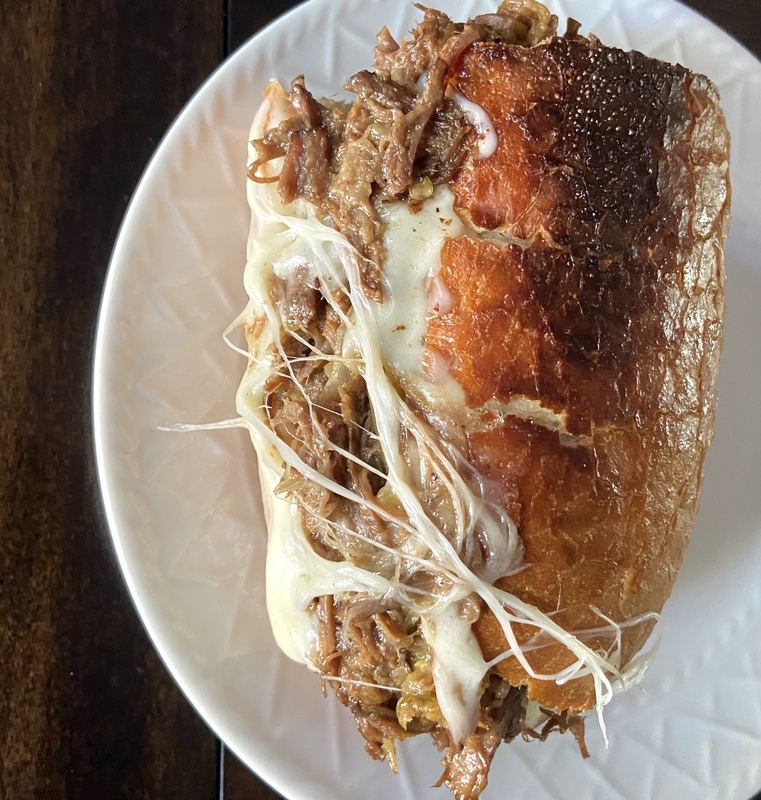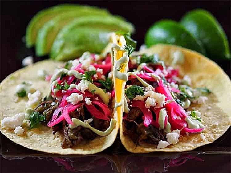 olive oil, 2 cups leftover brisket or pot roast (click on the link in the post for the brisket recipe), ½ cup chopped green chilies, 1 tsp garlic powder, 1 tsp ground cumin, ⅛ tsp Cayenne pepper, 1 tsp Mexican oregano, 1 tsp salt, 1 tsp pepper, Pickled Onions, 1 large purple onion thinly sliced, 2 cups apple cider vinegar, 1 cup of water, 3 tbs kosher salt, 4 tbs sugar, Avocado Cream, 1 avocado, 1 cup Mexican crema table cream (or sour cream), 1 clove garlic, 1 tsp ground cumin, 1 tsp salt, 1 tsp pepper, ⅛ tsp Cheyenne pepper, Extras, Corn tortillas, Chopped cilantro, Cojita cheese or Monterrey Jack