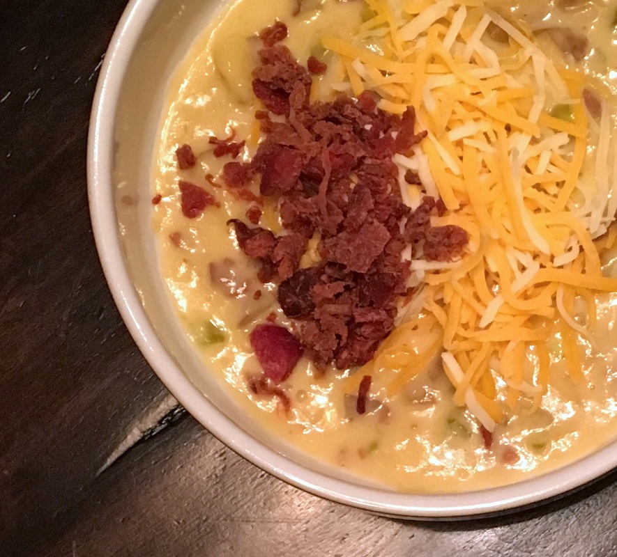 1 tablespoon olive oil, half an onion, minced, 2 cloves garlic, minced, 3-4 stalks of celery, minced, 1 jalapeno, minced, 1 red bell pepper, minced, 1 teaspoon smoked paprika (adds a bacon-like flavor), 1 bottle of beer (I used Blue Moon - just a basic wheat beer), 2 cups of chicken or vegetable broth, 4 tablespoons butter, 4 tablespoons flour, 1 cup whole milk (high fat milk is better), 8 ounces cheddar cheese, shredded, 4 ounces smoked cheddar cheese, shredded, salt and pepper to taste