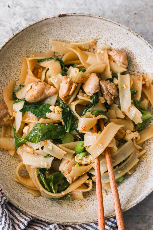 7 ounces brown rice noodles, 1 14 oz package tofu, 1 tablespoon olive oil for sautéing, 3-4 cup chopped vegetables (I used a pre-chopped fresh stir fry mix), 2 cloves minced garlic, peanuts, cilantro, and lime for serving, 1/4 cup soy sauce, 2-3 tablespoons brown sugar or honey, 1/4 cup water, 2-3 tablespoons white vinegar, to taste, 1 teaspoon chili paste, to taste