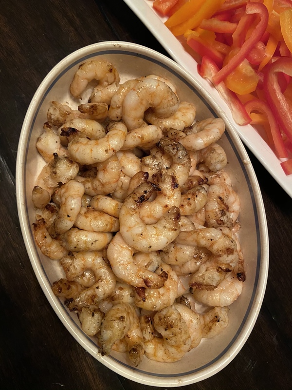 a quick swish of olive oil, 5 cloves garlic, minced, 2 hot peppers like serrano or jalapeño, minced, 4 cups mirepoix*, 2 cups additional chopped veggies (optional), 3 tablespoons cajun seasoning mix, 1 28-ounce can fire roasted diced tomatoes, 3 cups chicken or vegetable broth, 12 ounces Andouille sausage, sliced, 1 lb. raw tail-off shrimp, 6 tablespoons butter, 1/2 cup flour, 2 cups milk or chicken broth, heavy pinch of salt