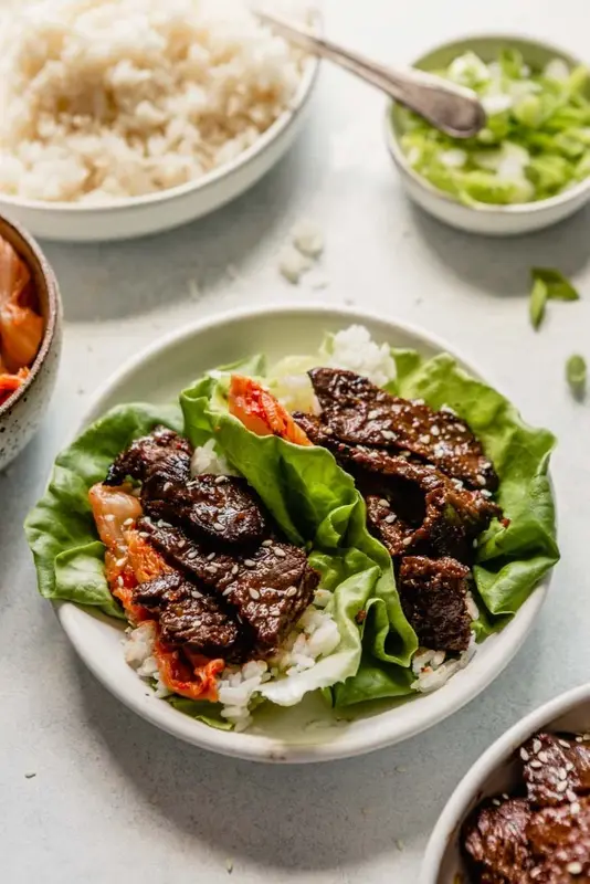¼ cup low-sodium soy sauce (or tamari if gluten-free*), ¼ cup grated white or yellow onion, 3 tablespoons honey, 1 tablespoon gochujang (gluten free if needed), 1 tablespoon minced garlic, 1 tablespoon mirin or rice wine**, 1 tablespoon toasted sesame oil, 2 teaspoons grated fresh ginger, ¼ teaspoon cracked black pepper, 1 pound boneless rib-eye or top sirloin (cut into ⅛–¼-inch thick slices), 2 teaspoons grapeseed oil (or other neutral oil), Cooked rice or quinoa, Lettuce cups, Kimchi, Sliced green onions, Sesame seeds, Ssamjang