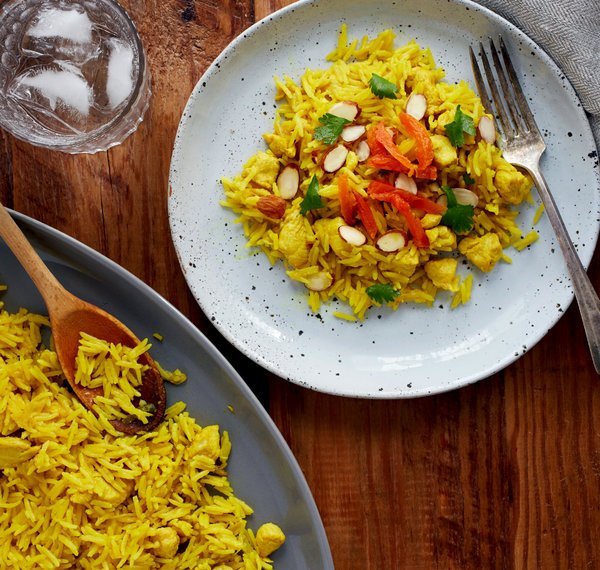 ¼ cup ghee (or use unsalted butter), 1 large yellow onion, peeled, halved and thinly sliced, 6 green cardamom pods, crushed, 3 whole star anise, 1 ¼ teaspoons kosher salt, divided, 6 garlic cloves, finely chopped, 1 ½ teaspoons turmeric powder, 1 pound boneless, skinless chicken breasts, cut into 3/4-inch pieces, 2 ¼ cups low-sodium chicken stock, 1 ½ cups basmati rice, ¼ cup chopped dried apricots, ¼ cup sliced raw almonds, toasted, ¼ cup chopped cilantro leaves