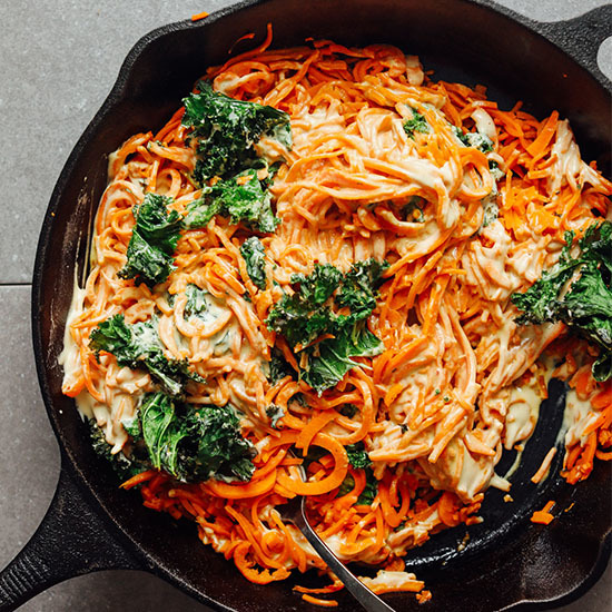 2 Tbsp (30 ml) water (or sub oil), 1/2 white or yellow onion, diced (55 g), 3 cloves garlic, minced (1 1/2 Tbsp or 9 g), 2 large carrots, peeled and sliced into thin rounds (120 g), 1 1/2 cups (150 g) green beans, trimmed, roughly chopped, 1/4 tsp each sea salt & black pepper + more to taste, 1 small zucchini (196 g) , sliced into 1/4-inch rounds, 1 15-ounce (425 g) can diced fire-roasted tomatoes, 6 cups (1440 ml) vegetable broth, 2 tsp dried basil (or 1 Tbsp fresh), 2 tsp dried oregano (or 1 Tbsp fresh), 1 Tbsp (3 g) nutritional yeast, optional: Pinch red chili pepper flake, 1 Tbsp (12 g) coconut sugar (or other sweetener to taste), 1 15-ounce (425 g) can white beans or chickpeas, rinsed + drained, 2 cups (224 g) gluten-free pasta noodles* (I like Trader Joe’s Gluten-Free Fusilli), 1 cup (25 g) kale or spinach (or other green), roughly chopped