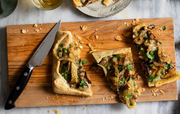 2 cups/255 grams all-purpose flour, plus more for rolling, Pinch of fine sea salt, 1 cup/225 grams cold unsalted butter (2 sticks), cut in 1/4-inch cubes, 1/2 cup/120 milliliters ice water, 2 tablespoons extra-virgin olive oil, plus a little more as needed, 1 onion, any kind, sliced into 1/4-inch half-moons (about 1 1/2 cups), Kosher salt and black pepper, 10 ounces/300 grams wild mushrooms, such as chanterelle, or cultivated shiitake, oyster or king trumpet mushrooms, sliced (about 4 cups), 2 garlic cloves, minced, 2 teaspoons chopped thyme, Pinch of red-pepper flakes (optional), 1/2 cup/120 milliliters crème fraîche, 3 tablespoons grated Parmesan, 2 tablespoons chopped flat-leaf parsley, for garnish