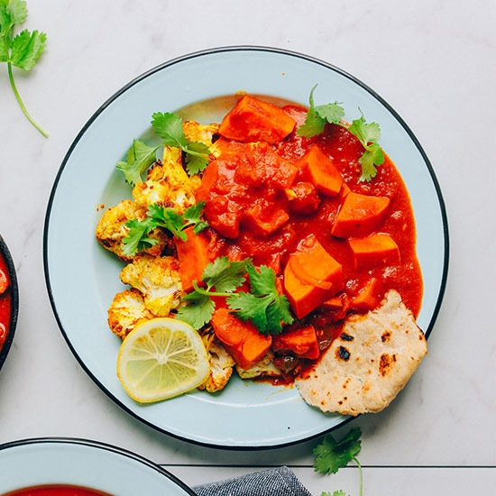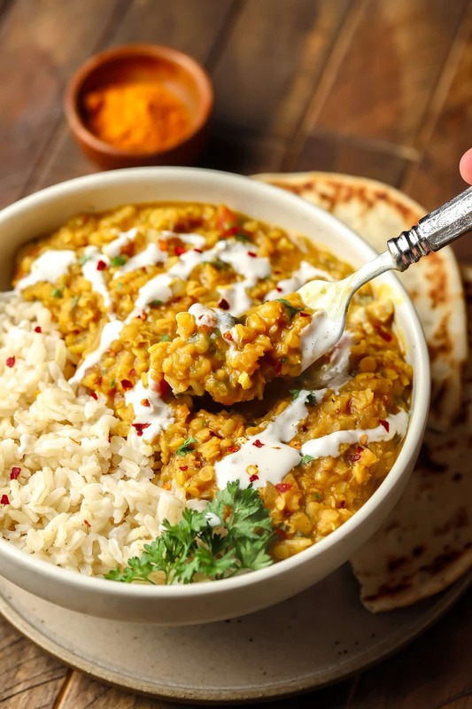 1 heaping tablespoon (20 mL) virgin coconut oil, 4 cups peeled (if necessary) and diced veggies*, 1/2 cup (100 g) uncooked red lentils, 1/2 cup (125 mL) water, plus more if needed, 1 (14-ounce/398 mL) can diced tomatoes, 1 (14-ounce/398 mL) can light coconut milk, 1 1/2 teaspoons (7.5 mL) garlic powder, 1 1/2 teaspoons (7.5 mL) minced onion**, 1 tablespoon (15 mL) good curry powder, or to taste***, ¾ to 1 teaspoon fine sea salt, to taste, Freshly ground black pepper, to taste, Cooked basmati rice or grain of choice, Fresh chopped cilantro leaves, Fresh lime juice