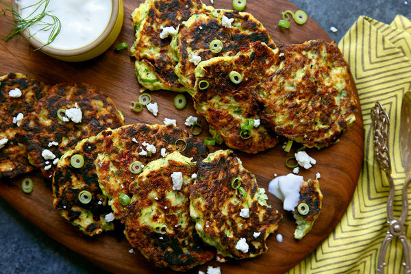 3 medium zucchini, shredded, Salt, freshly ground black pepper, 3 large eggs, beaten, ½ cup all-purpose flour, 1 tablespoon extra virgin olive oil, 1 cup crumbled feta cheese, 3 scallions, finely chopped, ⅓ cup finely chopped dill, 1 teaspoon baking powder, 4 to 6 tablespoons vegetable oil, more as needed, ⅔ cup plain yogurt, 2 cloves garlic, finely chopped, ½ teaspoon salt